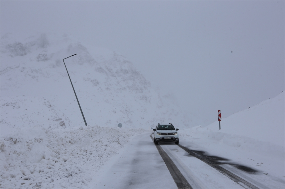 Kar kalınlığının 30 santimetreyi bulduğu bölgede, olumsuz hava koşulları nedeniyle ilerleyemeyen bazı kamyonlar Karabet Geçidi’ndeki kar tüneline bırakıldı.