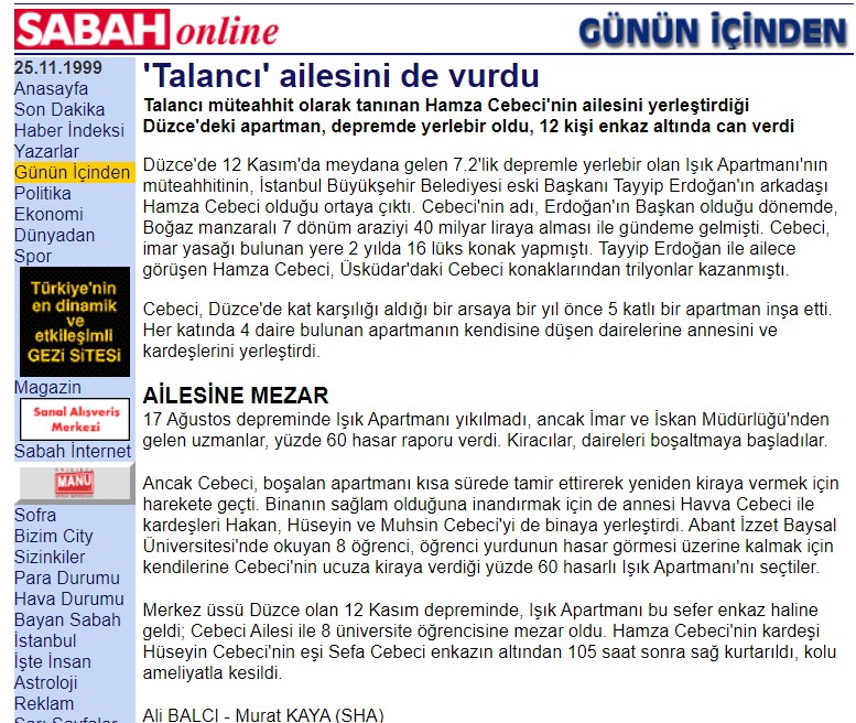 Hükümete yakınlığıyla bilinen Sabah gazetesi, Ali Bilgi ve Murat Kaya’nın 1999 tarihli haberinde Hamza Sebegi’nin “talan müteahhidi” olarak tanındığını belirtmişti.