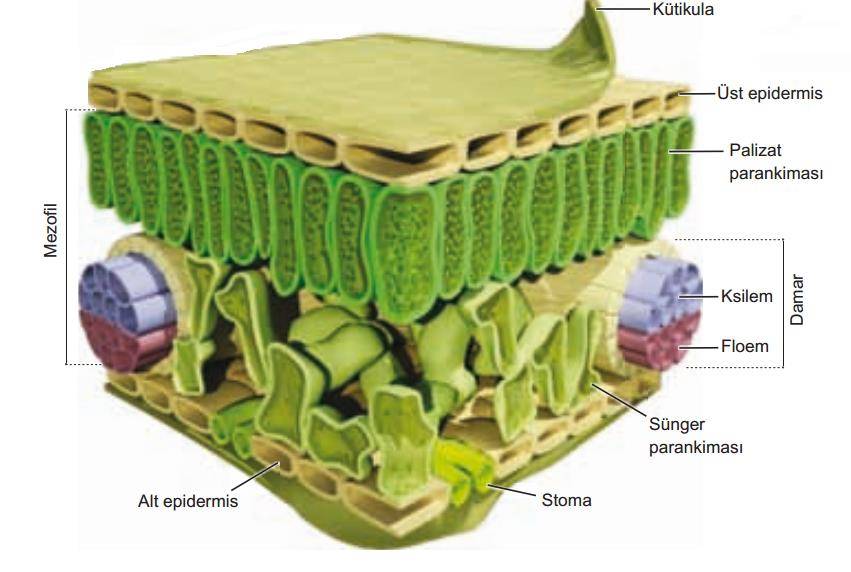 Fotosentez, bitkinin tüm yeşil kısımlarında meydana gelebilir, ancak çoğu bitkide, ışık tarafından en çok görülebilen yeşil dokuları içerdiklerinden, yapraklar fotosentezin birincil organlarıdır. Çoğu dikot yaprağı, bir gövde veya yaprak sapı ve düz bir avuçtan oluşur. Ayrıca, bazı yapraklarda, sapların tabanından stipül adı verilen küçük uzantılar görülebilir. Bununla birlikte, bazı yapraklar, özellikle monokotiledonların (otsu bitkiler) yaprak sapı yoktur. Bunlarda ayağın tabanı doğrudan vücuda bağlıdır. Yaprak bıçakları geniş ve düzdür ve karmaşık bir damar sistemi içerir. Avuç içi düzlüğü, yaprağın çok geniş bir alanının boyutuna göre ışığı görmesini sağlar.