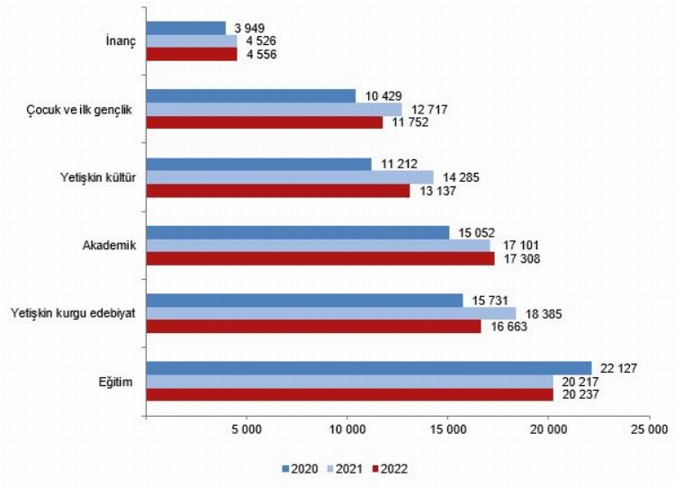 Türkiye’de 2022 yılında 69 bin 211 kitap yayımlanırken, yayıncılar tarafından 2022 yılında; 69 bin 211 kitap, 377 elektronik kitap (DVD, VCD, CD), 13 bin 246 web tabanlı elektronik kitap, 559 konuşan kitap (çevrim içi, kaset, CD, DVD) ve 260 diğer olmak üzere toplam 83 bin 653 materyal için ISBN alındı. Satılan kitap bandrolü sayısı 2022 yılında, 2021 yılına göre yüzde 13,3 azalarak 380 milyon 296 bin 402 adet oldu.