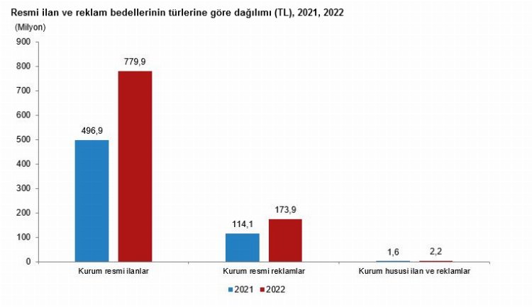 Bu arada Basın İlan Kurumunun idari kayıtlarından elde edilen bilgilere göre de, 2022 yılında ilan sahiplerinin mevzuat hükümleri doğrultusunda gazetelerde yayınlattığı icra, ihale, tebligat ve personel alımı gibi resmi ilanları ile bu kurumların gazete ve dergilerde yayınlattığı resmi reklamlarının toplam bedeli önceki yıla göre %56,1 artarak 956 milyon 063 bin 833 TL oldu.