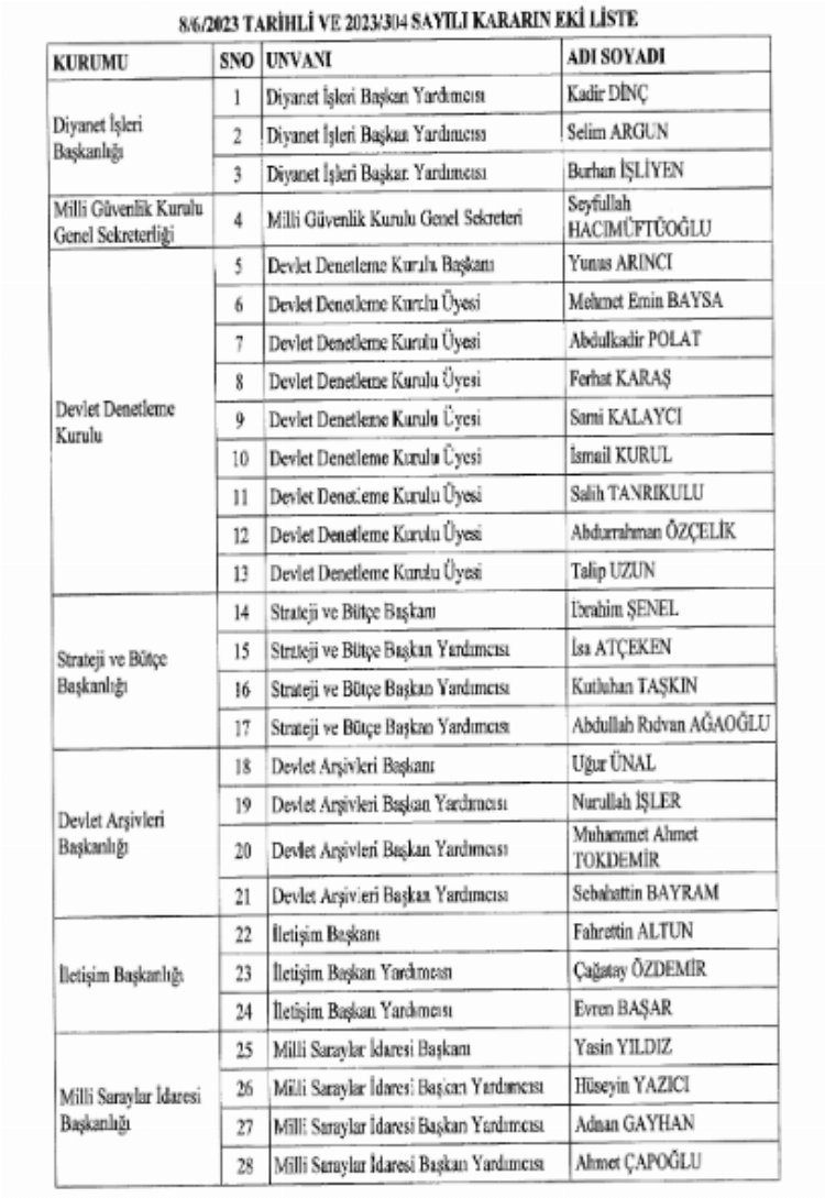 Buna göre Cumhurbaşkanlığı İdari İşler Başkanı Dr. Metin Kıratlı, İletişim Başkanı Prof. Dr. doktor. Cumhurbaşkanlığı Genelkurmay Başkan Yardımcısı Fahrettin Altun. doktor. Strateji ve Bütçe Başkanı Hasan Doğan, Sayıştay Başkanı İbrahim Şenel, Devlet Arşivleri Başkanı Yunus Aranji, Prof. doktor. Milli Saraylar Daire Başkanı Uğur Ünal ve Dr. Yasin Yıldız ve Milli Güvenlik Kurulu Genel Sekreteri Seyfullah Hakimovtoğlu yeniden aynı göreve atandı.