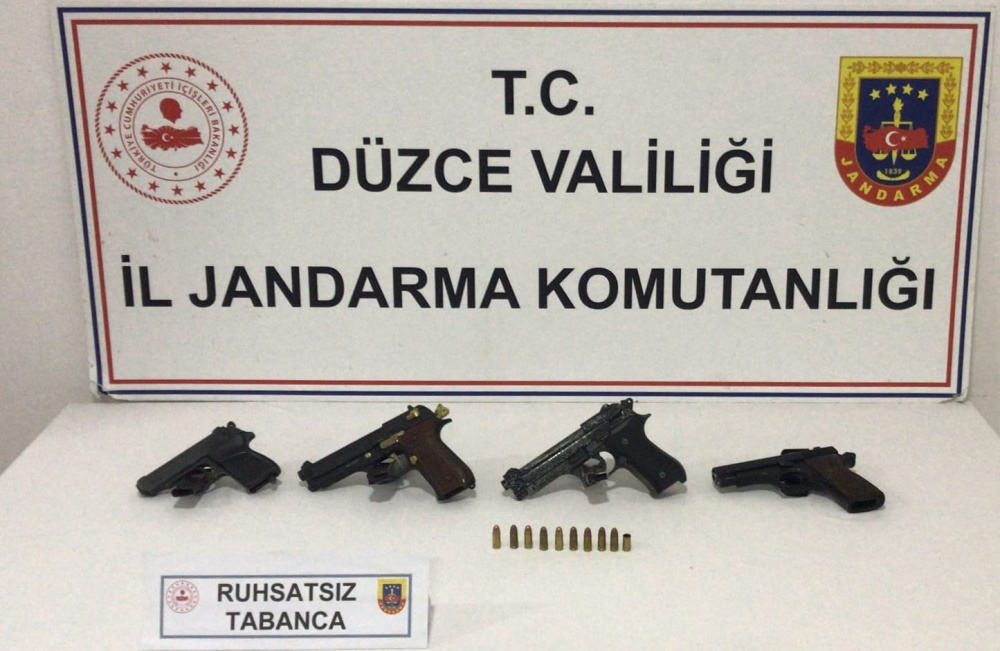 Evde ve araçta yapılan aramada 4 ruhsatsız tabanca ve bu silahlara ait mermiler ele geçirildi.