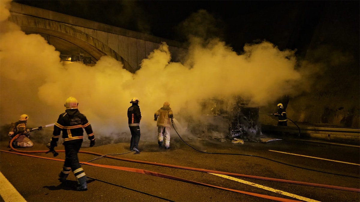 İstanbul-İzmir otoyolunda Kocaeli’den Bergama’ya hareket eden Mürsel Duran yönetimindeki 41 ACR 055 yolcu otobüsü, Orhangazi Tüneli girişinde henüz belirlenemeyen nedenle alev aldı.
