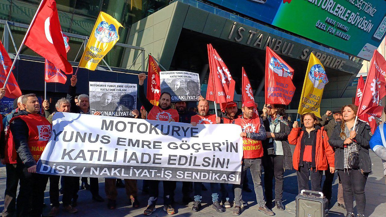 Nakliyat-İş Sendikası’ın çağrısıyla motokurye Yunus Emre Göçer’in katilinin iade edilmesi için Somali’nin İstanbul’da bulunan fahri konsolosluğu önünde basın açıklaması yapıldı. “Motokurye Yunus Emre Göçer’in katili iade edilsin” yazılı pankartın açıldığı basın açıklamasına Nakliyat-İş Sendikası Genel Başkanı Ali Rıza Küçükosmanoğlu, sendika yöneticileri, üyeleri, Sol Parti, Umut-Sen, HKP, Sporcular Parkı Forumu, İşçi Dayanışma Derneği ve Motokuryeler katıldı.
