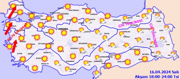 KUVVETLİ RÜZGAR UYARISI: Rüzgarın, Marmara’nın batısı ve Kuzey Ege kıyılarında güney ve güneybatı yönlerden kuvvetli (40-70 km/saat) olarak esmesi beklendiğinden, yaşanabilecek olumsuzluklara karşı dikkatli ve tedbirli olunmalıdır.