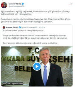 Manisa’da sendikacı oldukları için işten atılan işçiler eylem yaptı Başkentte öğrencilere su kullanımının azaltılması, otobüs abonelik hizmeti, iş istasyonları, kütüphaneler, çamaşırhaneler ve geçici barınma merkezleri gibi birçok projeyi hayata geçiren Ankara Büyükşehir Belediyesi, eğitimde fırsat eşitliğini sağlamak için imza attı. yeni bir uygulamada. Geçmiş yıllarda sosyal yardım alan ailelerin çocuklarının hizmet bedellerini karşılamaya başlayan Ankara …