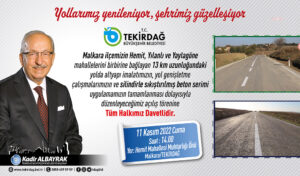 Tekirdağ Büyükşehir Belediyesi’nin yol yapım, onarım ve bakım çalışmalarını tamamladığı Malkara ilçesine bağlı Hamit Wellanlı ve Yaylagon ilçelerini birbirine bağlayan bağlantı yolu 11 Kasım Cuma günü saat 14:00’te açılacak. Tekirdağ Büyükşehir Belediyesi’nin yol yapım, onarım ve bakım çalışmalarını tamamladığı Malkara ilçesine bağlı Hamit Wellanlı ve Yaylagon ilçelerini birbirine bağlayan bağlantı yolu 11 Kasım Cuma günü …