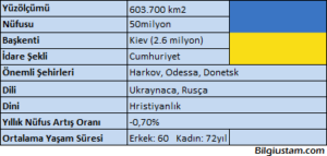 KomşuRusya Federasyonu, Beyaz Rusya, Polonya, Slovakya, Macaristan, Romanya ve Moldova ile komşudur.Güneyde Karadeniz ve Azak Denizi’ne kıyısı vardır. Yer şekilleriÜlke genelinde 400 m’yi geçmeyen yaylalar geniş bir alanı kaplar.– Batıda Karpat Dağları ve Kırım’ın dağlık bölgeleri ülkenin başlıca engebeli bölgeleridir.– Dinyeper Nehri ve Dinyester Nehri burada yer almaktadır. İklim ve bitki örtüsüKarasal iklim hakimdir.– Ancak, …