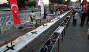 Aydın, yaklaşık 1 ayda 100 metrelik mangal ve 100 metrelik şişleri hazırladı. 29 Ekim günü 150 kilogram zırh kıyması hazırlayan Aydın, 20 kebap ustasının yardımıyla 100 metrelik şişe saplanan boru kebabını hazırladı. Yaklaşık 20 dakikada pişirilen 100 metrelik boru kebabı daha sonra 500 kişiye dağıtıldı. “İNŞALLAH TORUNLARIMIZIN ÇOCUKLARI 200 METRELERİ YAPSIN” Yaşar Aydın, yaptığı boru …