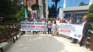 Muhabir: Sabri Qardar Acil ekstra zamana ihtiyacımız var. Antalya’daki Büro İşçileri Sendikası şubesi, SGK Bölge Müdürlüğü önünde basın açıklaması yaparak, “Acil ek zam talep ediyoruz.” Büro Emekçileri Sendikası adına konuşan BES Antalya Şube Başkanı Devrim Mol, başkanın ek zamma ilişkin açıklamasını samimi bulmadıklarını belirterek, asılsız vaatlerle doluyuz, kamu çalışanları için asgari ücret talebimizi yineliyoruz. , …