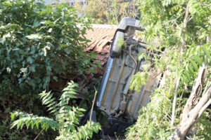 Denizli’de yolun altındaki evin çatısına devrilen otomobilin sürücüsü yaralandı