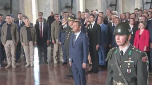 Özel başkanlığındaki heyet, Aslanlı Yol’dan yürüyerek Atatürk’ün mozolesine geldi. Özel’in mozoleye çelenk koymasının ardından saygı duruşunda bulunuldu. Daha sonra beraberindekilerle Misak-ı Milli Kulesi’ne geçen Özel, Anıtkabir Özel Defteri’ne şunları yazdı: “Aziz Atatürk, Sayın Genel Başkanım, 31 Mart yerel seçimlerinde milletimizin oylarıyla seçilen ve milletimize hizmet edecek olan belediye başkanlarımız, 81 ilimizde emanetinize sahip çıkan il …