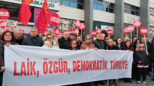SOL Parti, Ankara Kızılay Sakarya Caddesi’nde “Laiklik, Özgürlük ve Demokrasi Buluşması” düzenledi. Eyleme katılanlar, “Laik, Özgür, Demokratik Türkiye” ve “Laikliği savunuyoruz” yazılı pankartlar taşırken, “Yok başka yolu, yok bu saltanat bitecek”, “Kahrolsun şeriat, yaşasın laiklik”, “168 değil, on binlerceyiz”, “Karanlığı parçala, memlekete sahip çık” sloganları attı. Eylemde söz alan konuşmacılar, “laikliği birlikte savunuyoruz” bildirisine imza …