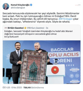 Millet İttifakı’nın Cumhurbaşkanı Adayı ve CHP Genel Başkanı Kemal Kılıçdaroğlu, Cumhurbaşkanı ve AKP Genel Başkanı Recep Tayyip Erdoğan’ın Twitter hesabından “Manevi değerlere duyarlı olmayanın seccadede gözü yoktur” sözlerine; Seccadeler hakkında söylenebilecek her şeyi söyledik. Samimi Müslümanlar beni anlar. Peki bunun olmayacağını Erdoğan bilmiyor mu? Bilinen. Bu farklı. Bu onun etkilerinden biridir. Bu zehirli dili biliyoruz. …
