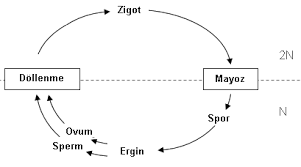 Bitkilerin yaşam döngüsünde mayoz Mayoz genellikle bitkilerde spor adı verilen ve genellikle mitotik olarak bölünen ve çok hücreli haploid bitki yapılarına dönüşen haploid üreme hücreleri üretir. Alışılmadık bir bitki üreme biçimi, ilkel alg benzeri bitkilerde meydana gelir. Haploid sporofit (birinci aşama) mitozla bölünür ve hızla büyüyen, farklılaşmamış, haploid çok hücreli bir aşamaya (ikinci aşama) geçer. …