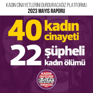 Kadın Cinayetlerini Durduracağız Platformu 2023 raporunu Mayıs ayında yayınladı. Buna göre Mayıs ayında 40 kadın erkekler tarafından öldürüldü. 22 kadın şüpheli bir şekilde ölü bulundu. Raporda, ölen 40 kişiden 7’sinin boşanmak isteme, barışmayı reddetme, evlenmeyi reddetme, ilişkiyi reddetme gibi hayatlarıyla ilgili kararlar almak isteme bahanesiyle öldürüldüğüne dikkat çekildi. 40 ölüm kadındı ve 22 şüpheli kadın …