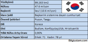 KomşuKore Yarımadası’nın güneyinde yer almaktadır.Kuzeyinde Kuzey Kore, doğusunda Japon Denizi, batısında Sarı Deniz ve güneyinde Kore Boğazı ile çevrilidir. Yer şekilleri– Dağlık bir ülke.Kıyılar birbirinden çok uzak.Kıyılarında birçok ada var. İklim ve bitki örtüsüÜlkede muson iklimi hakimdir. Orman bitki örtüsü. Nüfus ve yerleşim– Nüfus yoğunluğu yüksek ülkeler arasında.Ülkenin nüfusu başkent Seul ve çevre şehirlerde yoğunlaşmıştır. …