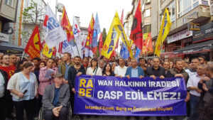 İstanbul Emek, Barış ve Demokrasi Güçleri’nin çağrısıyla Kadıköy DEM Parti Kadıköy İlçe Örgütü önünde bir araya gelen yüzlerce kişi, Van Büyükşehir Belediyesi Eşbaşkanı Abdullah Zeydan’ın memnu hakkının Adalet Bakanlığı’nın “talimatıyla” geri alınmasını protesto etti. DEM Parti, Van Büyükşehir Belediyesi’ni %55 oyla kazandı. AKP’li aday %27 oy aldı. Kadıköy’de bir araya gelen yüzlerce kişi “Van’da Hırsız …