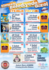 Elmadağ Belediyesi, 24 Ocak – 4 Şubat tarihleri ​​arasında yarıyıl tatilinde çocukları ücretsiz gösterilerle buluşturacak. Elmadağ, Hasanoğlan ve Yeşildere ilçelerinde birbirinden güzel tiyatro ve sinema gösterileri, Belediye Kültür ve Sosyal İşler Müdürlüğü tarafından çocuklara ücretsiz sunulacak. Elmadağ Belediye Başkanı Adem Barış Aşkın, “Okullar yarıyıl tatiline girerken çocuklarımız için kültür sanat etkinlikleri düzenliyoruz. Tatilini verimli, eğlenceli …