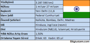 KomşuArap Denizi ve Hint Okyanusu ile çevrilidir.Pakistan, Bangladeş, Burma, Çin, Nepal ve Butan ile sınır komşusudur. Yer şekilleriArazi çeşitlidir.Kuzeyde Himalayalar, batı kıyısında Batı Ghats ve doğu kıyısında Doğu Ghats yer alır.Hindistan’ın çoğu yaylalarla kaplıdır. En önemli yaylası Deccan Yaylasıdır.Kuzeybatıda Tar Çölü bulunur.Hindistan alt kıtasını Orta Asya’dan ayıran Himalayalar, dünyanın en yüksek sıradağlarını oluşturur.Ganj en önemli …