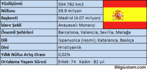 Komşu– Avrupa’nın güneybatısında, İber Yarımadası’nda yer almaktadır.Fransa ve Portekiz ile komşudur. Kuzey ve güneybatısında Atlantik Okyanusu, güneyinde ve doğusunda Akdeniz ile çevrilidir. Yer şekilleri– Ülke arazi bakımından farklılık gösterir.Maysata Platosu ülkenin büyük bölümünü kaplar.Bu plato Pireneler, İber Dağları ve Pitec Dağları ile çevrilidir. İklim ve bitki örtüsüÜlkenin iklimi, Atlantik Okyanusu’ndan gelen batı rüzgarları ve Sahra …