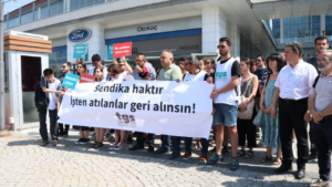 Haber:Hülya Kılınç A 101’in Karaağaçlı’da bulunan Bölge Müdürlüğü’nde çalışan 3 personel DİSK /LİMTER İŞ Sendikası’na üye oldukları için geçtiğimiz hafta gerekçe gösterilmeden tazminatsız olarak işten çıkarıldı. İşten çıkarılan çalışanlar bugün A 101 Bölge Müdürlüğü önünde yaptıkları eylemle işlerini geri istedi. İşçilerin eylemine; DİSK/ LİMTER İŞ Sendikası Genel Başkanı Kanber Saygılı, Cam Keramik-İş Merkez Yöneticisi Hasan …
