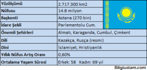 KomşuRusya, Çin, Türkmenistan, Özbekistan ve Kırgızistan ile komşudur.Güneybatıda Hazar Denizi ile çevrilidir. Yer şekilleriUral Dağları ile Altay arasında Kazak Platosu uzanır.– Hazar Denizi’nin kuzeyinde Kuzey Hazar Ovası yer alır.– Kuzeyde Turan Ovası ve Hazar Denizi ile Aral Gölü arasındaki Yukarı Yurt Yaylası. Aral, Belqas ve Tengiz gölleri önemlidir. Aral Gölü sulama amaçlı kullanıldığı için kuruma …