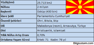 Komşu– Balkan Yarımadası’nda bulunan ülkenin Sırbistan, Arnavutluk, Yunanistan ve Bulgaristan ile sınırı vardır. Yer şekilleriMakedonya, yüksek Dinar Alpleri ile kaplıdır.– İç kısımlarda, Vardar Nehri ve kolları tarafından parçalanan plato. Burada verimli tarım alanları var.Vardar Nehri, ülkenin en önemli nehridir. Ohri ve Prespa Gölleri Arnavutluk sınırında yer almaktadır. İklim ve bitki örtüsüMakedonya’da karasal iklim hakimdir. Kışlar …
