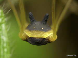 Ekvatorun yağmur ormanlarında yaşayan bu biçerdöver, ilginç görünümü ile diğer eklembacaklılardan oldukça farklıdır. Bilimsel adı; “Metagryne bicolumnata” olmasına rağmen tavşan kulaklı görünümünden dolayı “Bunny Harvestman” olarak anılır. Siyah köpeğe benzeyen kafası, tavşan kulakları ve uzun bacaklarıyla farklı bir örümceğe benzese de örümcek değildir. Eklembacaklılar sınıfındadır.Doğa fotoğrafçısı Andreas Kaye’nin Ekvador yağmur ormanlarında 11 Temmuz 2017’de çektiği …