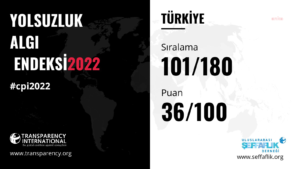 Uluslararası Şeffaflık Örgütü tarafından 1995 yılından bu yana her yıl yayınlanan Yolsuzluk Algılama Endeksi 2022 raporu açıklandı. 2021’de 96’ncı sırada yer alan Türkiye, 2022’de 180 ülke arasından 36 puanla 101’inci sıraya geriledi. Rusya-Ukrayna savaşı sonrasında ülkeye giren kayıt dışı para miktarının artması, yargının siyasallaşması, sivil toplum alanının daralması, muhalefet baskıları ve Avrupa İnsan Hakları Mahkemesi …