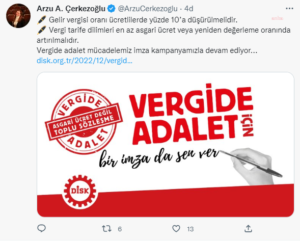İSTANBUL (AA) – Devrimci İşçi Sendikaları Konfederasyonunca (DİSK) vergide adalet talebiyle basın açıklaması yapıldı. Beşiktaş Meydanı’nda bir araya gelen sendika üyeleri, bir süre slogan attı. DİSK Genel Başkanı Arzu Çerkezoğlu, basın açıklamasında, gelirde ve vergide adalet istediklerini söyledi. İnsanca yaşayacak ücret için alanlarda, meydanlarda, sokaklarda olduklarını dile getiren Çerkezoğlu, şöyle konuştu: “İş yerlerinden başlayan bu …