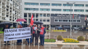 Artan tarifelerin uygulanmasına iki gün kala SOL Partisi Antalya İl Teşkilatı, toplu ulaşıma yapılan zammı protesto etti. Antalya Büyükşehir Belediyesi önünde toplanan SOL Partisi Antalya İl Teşkilatı üyeleri, “Ulaşım doğru! Fiyatları geri alın!” diyerek pankartı açtı ve basın açıklaması yaptı. Antalya halkı seni bu koltuğa AKP tarzında benim ülkemin işini yap diye koymadı. Sol Parti …